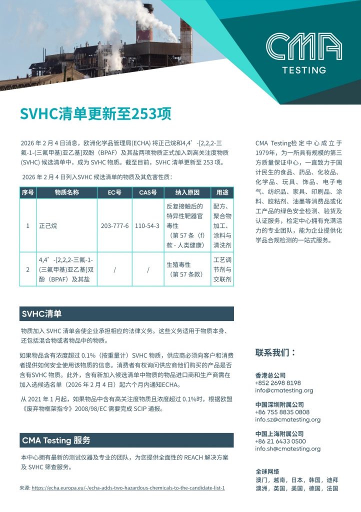 2026年2月4日消息,欧洲化学品管理局(ECHA) 将正己烷和4,4′-[2,2,2-三氟-1-(三氟甲基)亚乙基]双酚(BPAF)及其盐两项物质正式加入到高关注度物质 (SVHC) 候选清单中,成为SVHC物质。截至目前,SVHC清单更新至253项。